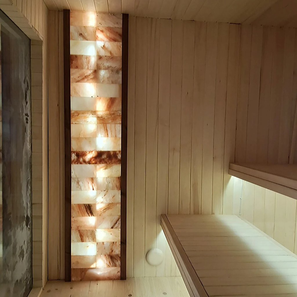 Do każdej sauny montujemy panel z soli himalajskiej, składający się z 40 cegieł oraz podświetlenia LED 3000K